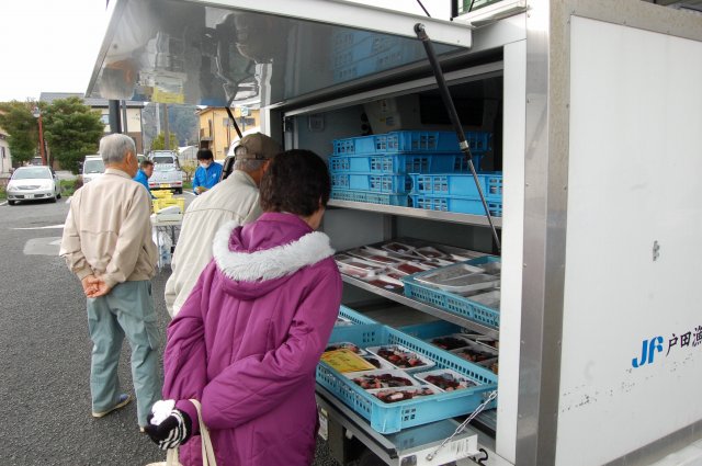 | 韮山、修善寺の2カ所に出張販売いたします!! ![]() ![]() 戸田港、駿河湾でとれた新鮮な旬の魚が勢ぞろい! 午前3時に市場から仕入れた新鮮な魚介類も並びます! 売り切れごめん! イナダやカツオなどを丸一匹で販売も!(季節や前日の天候に左右されます) 脂の乗った刺身、エビ・カニ・深海魚、干物各種、 お手頃な生鮮珍味など魚介満載! 駿河湾産は味が違います! お近くにお住まいの皆様、ぜひ販売車までお越しください!! 季節の旬の鮮魚各種、マグロ刺身(毎度完売)、 アジの干物、各種干物、釜揚げシラス、いかの塩辛、いかの三升漬、 イワシバーグ、わかめ、切コブ、洗いもずく、アサリやシジミ、タラコ、 9月中旬から5月中旬は底引き網漁の深海魚や深海エビなど 伊豆の国市韮山<JA伊豆の国 グリーンプラザ> 伊豆市修善寺<JA伊豆の国 農の駅> 伊豆の国市(会場:JA伊豆の国グリーンプラザ店舗前特設会場)※リンクは直売所ページです 毎週月曜日 時間 午前9時頃から11時頃(魚が無くなり次第終了とさせて頂くこともあります。) 伊豆市(会場:JA伊豆の国農の駅特設会場)※リンクは直売所ページです ![]() 毎週木曜日 時間 午前9時頃から11時頃(魚が無くなり次第終了とさせて頂くこともあります。) |